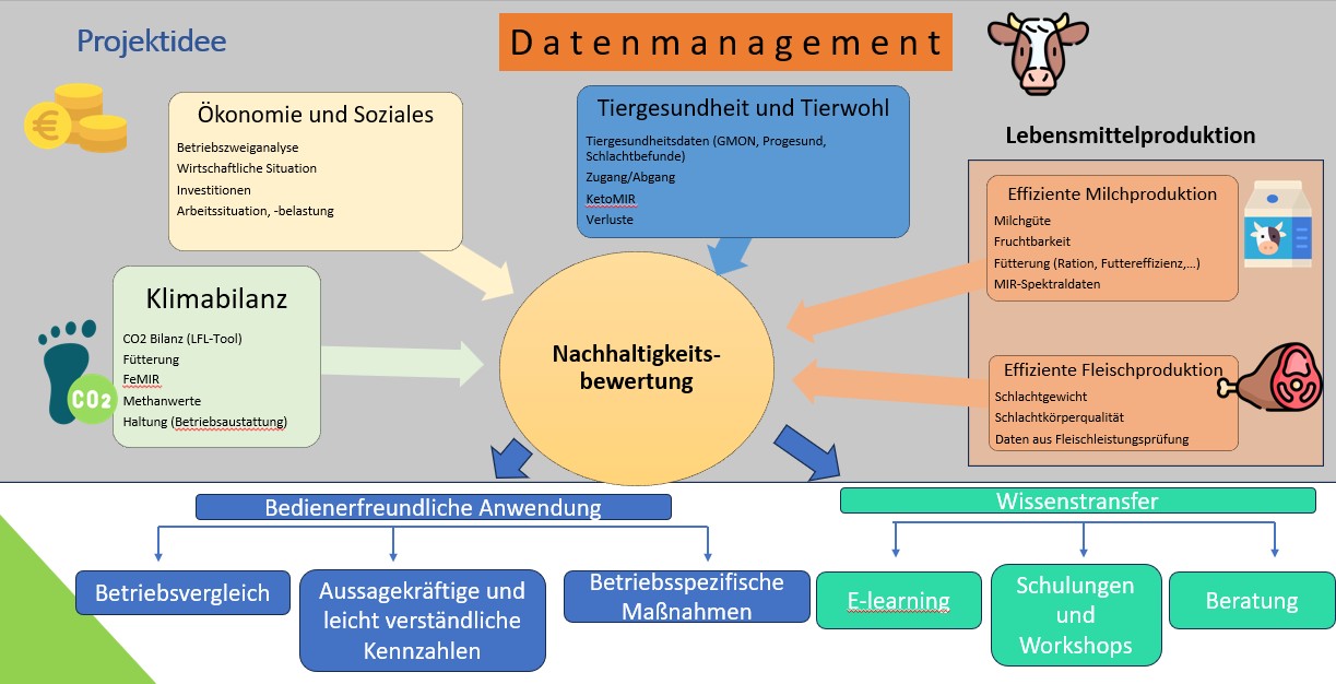 Ziel des Vorhabens ist es, Erkenntnisse und Synergien aus vorhergehenden Projekten zu bündeln und daraus ein umfassendes Nachhaltigkeitsbewertungssystem für Milch- und Fleischerzeuger zu entwickeln. Hierfür werden Daten der Schlachttierbefunde, der MLP, GMON Rind BW/ProGesund, sowie dem LfL-Klima-Check integriert, um eine fundierte und praxisnahe Einschätzung der betrieblichen Nachhaltigkeit zu ermöglichen.
